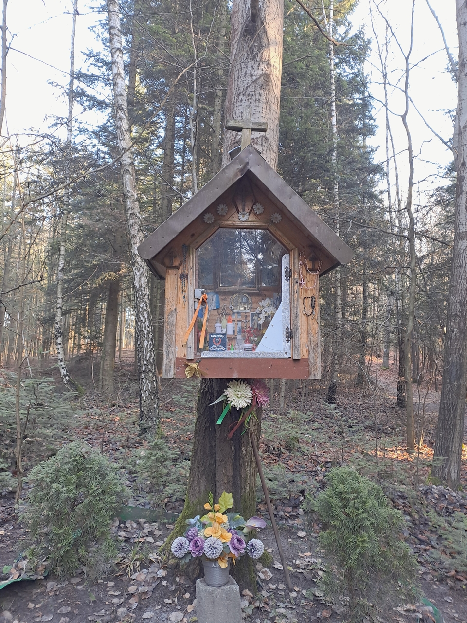 “Zdobyliśmy” najwyższy szczyt w tej okolicy - Pierścienicę (367 m n.p.m.), sesja zdjęciowa i dalej w drogę, a po drodze trochę smutnej historii.