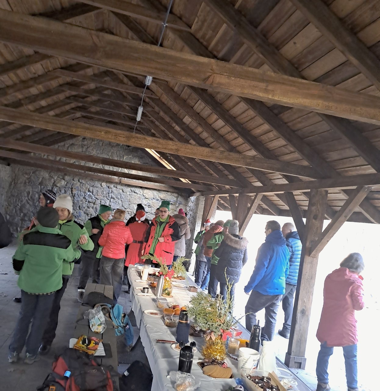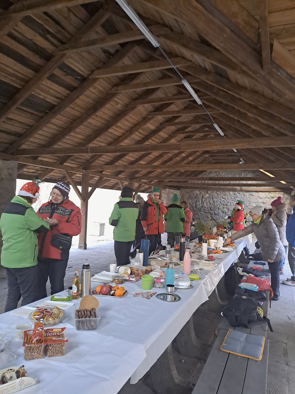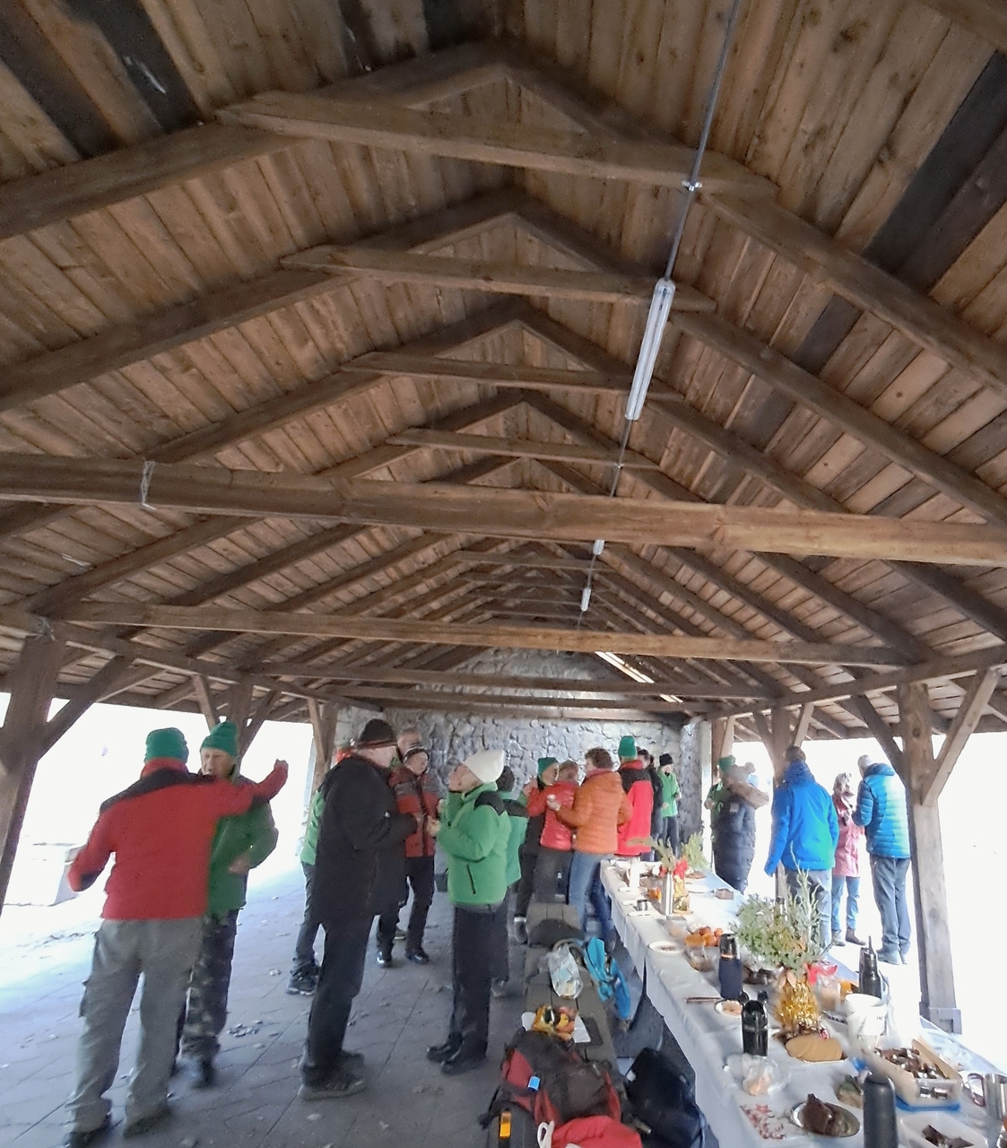 Pod wiatą zastaliśmy pięknie nakryte białymi obrusami stoły, przystrojone świątecznymi stroikami i zastawione słodkimi specjałami oraz owocami. Wszystko to dzięki Wioletcie Kasińskiej - sektetarzowi KTP PTTK Przygoda i współpracującym z nią członkiniom Klubu, które bezpośrednio dotarły na Wigilię pod wiatę. W obawie o pominięcie którejś nie wymieniam imion.