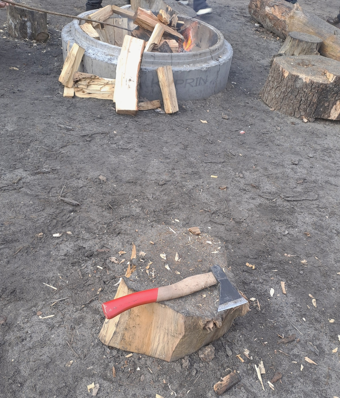 Teraz już prosto pod wiatę gdzie czekało na nas mocno buzujące ognisko, rozpalone przez przygodowych kolegów Andrzeja i Olka. Chwała im za to, bo sztuką było wzniecić ogień z drewnianych, namokniętych kloców. Olek zdradził mi w sekrecie, że przytargał pod pachą część swojej wersalki, którą właśnie utylizował. To uratowało sytuację, drewno z wersalki było wręcz przesuszone, co zdecydowanie pomogło w rozpaleniu ogniska.