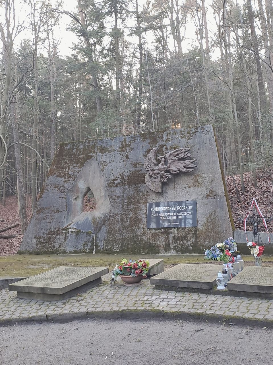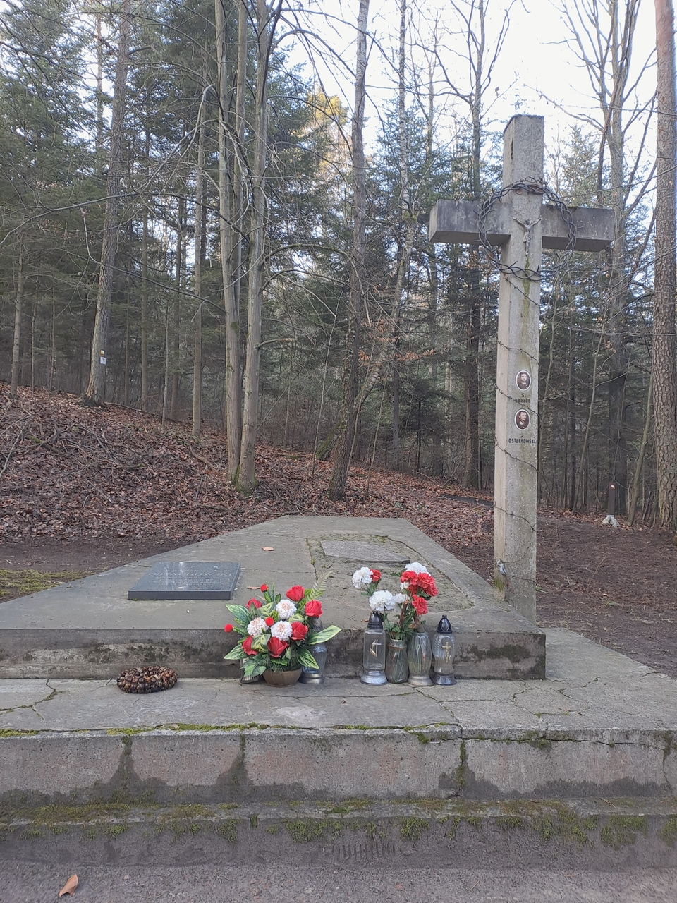 Zatrzymaliśmy się na chwilę przy Pomniku masowych straceń na zboczu Góry Pierścienicy, który powstał w 1960 r. ku upamiętnieniu pogrzebania w zbiorowych mogiłach, w różnych częściach lasu, prawdopodobnie kilkunastu tysięcy osób. Na Pomniku widnieje napis “Pomordowanym Rodakom przez hitlerowskich najeźdźców w latach 1939 - 1945”. Prezes Jan Wiórek oraz krajoznawca i sympatyk Przygody Janusz Kędracki przybliżyli nam historię tego miejsca.