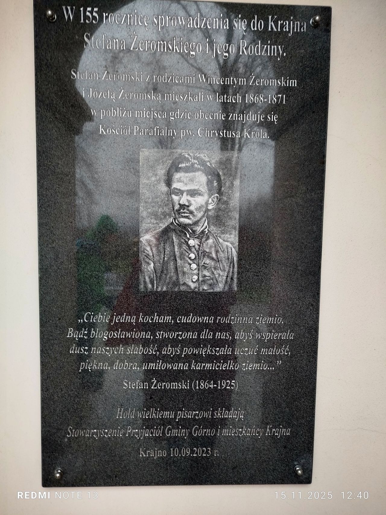 Po pamiątkowym wspólnym zdjęciu i zapaleniu znicza, ze Stróżnej udaliśmy się w kierunku widocznego już z daleka kościoła w Krajnie. Tam przy wejściu do świątyni wmurowane są dwie tablice, jedna upamiętniająca rozstrzelanie w dniu 4 czerwca 1943 roku, kilkunastu mieszkańców miejscowości, jako represja za pomoc partyzantom. Druga tablica informuję o fakcie zamieszkiwania, wraz z rodzicami, wówczas kilkuletniego Stefana Żeromskiego.